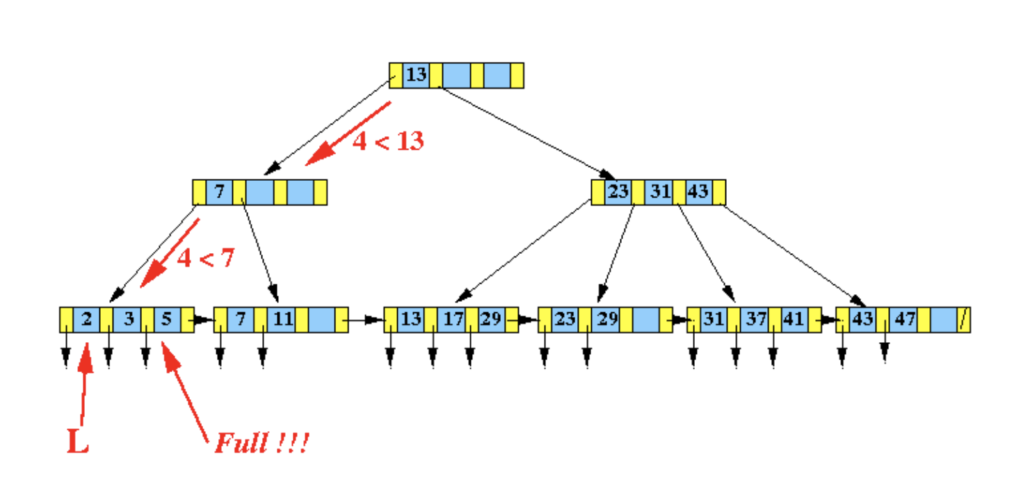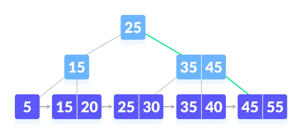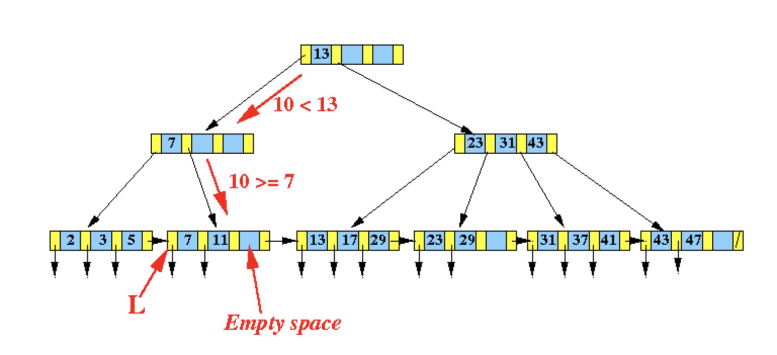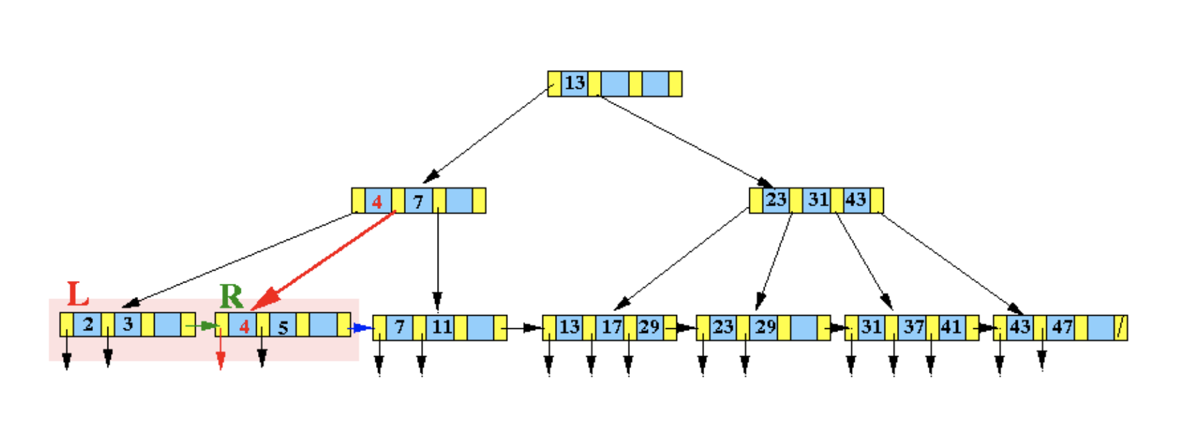 // Deletion operation on a B+ tree in C++#include<climits>#include<fstream>#include<iostream>#include<sstream>usingnamespacestd;intMAX=3;classBPTree;classNode{boolIS_LEAF;int*key,size;Node**ptr;friendclassBPTree;public:Node();};classBPTree{Node*root;voidinsertInternal(int,Node*,Node*);voidremoveInternal(int,Node*,Node*);Node*findParent(Node*,Node*);public:BPTree();voidsearch(int);voidinsert(int);voidremove(int);voiddisplay(Node*);Node*getRoot();};Node::Node(){key=newint[MAX];ptr=newNode*[MAX+1];}BPTree::BPTree(){root=NULL;}voidBPTree::insert(intx){if(root==NULL){root=newNode;root->key[0]=x;root->IS_LEAF=true;root->size=1;}else{Node*cursor=root;Node*parent;while(!cursor->IS_LEAF){parent=cursor;for(inti=0;i<cursor->size;i++){if(x<cursor->key[i]){cursor=cursor->ptr[i];break;}if(i==cursor->size-1){cursor=cursor->ptr[i+1];break;}}}if(cursor->size<MAX){inti=0;while(x>cursor->key[i]&&i<cursor->size)i++;for(intj=cursor->size;j>i;j--){cursor->key[j]=cursor->key[j-1];}cursor->key[i]=x;cursor->size++;cursor->ptr[cursor->size]=cursor->ptr[cursor->size-1];cursor->ptr[cursor->size-1]=NULL;}else{Node*newLeaf=newNode;intvirtualNode[MAX+1];for(inti=0;i<MAX;i++){virtualNode[i]=cursor->key[i];}inti=0,j;while(x>virtualNode[i]&&i<MAX)i++;for(intj=MAX+1;j>i;j--){virtualNode[j]=virtualNode[j-1];}virtualNode[i]=x;newLeaf->IS_LEAF=true;cursor->size=(MAX+1)/2;newLeaf->size=MAX+1-(MAX+1)/2;cursor->ptr[cursor->size]=newLeaf;newLeaf->ptr[newLeaf->size]=cursor->ptr[MAX];cursor->ptr[MAX]=NULL;for(i=0;i<cursor->size;i++){cursor->key[i]=virtualNode[i];}for(i=0,j=cursor->size;i<newLeaf->size;i++,j++){newLeaf->key[i]=virtualNode[j];}if(cursor==root){Node*newRoot=newNode;newRoot->key[0]=newLeaf->key[0];newRoot->ptr[0]=cursor;newRoot->ptr[1]=newLeaf;newRoot->IS_LEAF=false;newRoot->size=1;root=newRoot;}else{insertInternal(newLeaf->key[0],parent,newLeaf);}}}}voidBPTree::insertInternal(intx,Node*cursor,Node*child){if(cursor->size<MAX){inti=0;while(x>cursor->key[i]&&i<cursor->size)i++;for(intj=cursor->size;j>i;j--){cursor->key[j]=cursor->key[j-1];}for(intj=cursor->size+1;j>i+1;j--){cursor->ptr[j]=cursor->ptr[j-1];}cursor->key[i]=x;cursor->size++;cursor->ptr[i+1]=child;}else{Node*newInternal=newNode;intvirtualKey[MAX+1];Node*virtualPtr[MAX+2];for(inti=0;i<MAX;i++){virtualKey[i]=cursor->key[i];}for(inti=0;i<MAX+1;i++){virtualPtr[i]=cursor->ptr[i];}inti=0,j;while(x>virtualKey[i]&&i<MAX)i++;for(intj=MAX+1;j>i;j--){virtualKey[j]=virtualKey[j-1];}virtualKey[i]=x;for(intj=MAX+2;j>i+1;j--){virtualPtr[j]=virtualPtr[j-1];}virtualPtr[i+1]=child;newInternal->IS_LEAF=false;cursor->size=(MAX+1)/2;newInternal->size=MAX-(MAX+1)/2;for(i=0,j=cursor->size+1;i<newInternal->size;i++,j++){newInternal->key[i]=virtualKey[j];}for(i=0,j=cursor->size+1;i<newInternal->size+1;i++,j++){newInternal->ptr[i]=virtualPtr[j];}if(cursor==root){Node*newRoot=newNode;newRoot->key[0]=cursor->key[cursor->size];newRoot->ptr[0]=cursor;newRoot->ptr[1]=newInternal;newRoot->IS_LEAF=false;newRoot->size=1;root=newRoot;}else{insertInternal(cursor->key[cursor->size],findParent(root,cursor),newInternal);}}}Node*BPTree::findParent(Node*cursor,Node*child){Node*parent;if(cursor->IS_LEAF||(cursor->ptr[0])->IS_LEAF){returnNULL;}for(inti=0;i<cursor->size+1;i++){if(cursor->ptr[i]==child){parent=cursor;returnparent;}else{parent=findParent(cursor->ptr[i],child);if(parent!=NULL)returnparent;}}returnparent;}voidBPTree::remove(intx){if(root==NULL){cout<<"Tree empty\n";}else{Node*cursor=root;Node*parent;intleftSibling,rightSibling;while(!cursor->IS_LEAF){for(inti=0;i<cursor->size;i++){parent=cursor;leftSibling=i-1;rightSibling=i+1;if(x<cursor->key[i]){cursor=cursor->ptr[i];break;}if(i==cursor->size-1){leftSibling=i;rightSibling=i+2;cursor=cursor->ptr[i+1];break;}}}boolfound=false;intpos;for(pos=0;pos<cursor->size;pos++){if(cursor->key[pos]==x){found=true;break;}}if(!found){cout<<"Not found\n";return;}for(inti=pos;i<cursor->size;i++){cursor->key[i]=cursor->key[i+1];}cursor->size--;if(cursor==root){for(inti=0;i<MAX+1;i++){cursor->ptr[i]=NULL;}if(cursor->size==0){cout<<"Tree died\n";delete[]cursor->key;delete[]cursor->ptr;deletecursor;root=NULL;}return;}cursor->ptr[cursor->size]=cursor->ptr[cursor->size+1];cursor->ptr[cursor->size+1]=NULL;if(cursor->size>=(MAX+1)/2){return;}if(leftSibling>=0){Node*leftNode=parent->ptr[leftSibling];if(leftNode->size>=(MAX+1)/2+1){for(inti=cursor->size;i>0;i--){cursor->key[i]=cursor->key[i-1];}cursor->size++;cursor->ptr[cursor->size]=cursor->ptr[cursor->size-1];cursor->ptr[cursor->size-1]=NULL;cursor->key[0]=leftNode->key[leftNode->size-1];leftNode->size--;leftNode->ptr[leftNode->size]=cursor;leftNode->ptr[leftNode->size+1]=NULL;parent->key[leftSibling]=cursor->key[0];return;}}if(rightSibling<=parent->size){Node*rightNode=parent->ptr[rightSibling];if(rightNode->size>=(MAX+1)/2+1){cursor->size++;cursor->ptr[cursor->size]=cursor->ptr[cursor->size-1];cursor->ptr[cursor->size-1]=NULL;cursor->key[cursor->size-1]=rightNode->key[0];rightNode->size--;rightNode->ptr[rightNode->size]=rightNode->ptr[rightNode->size+1];rightNode->ptr[rightNode->size+1]=NULL;for(inti=0;i<rightNode->size;i++){rightNode->key[i]=rightNode->key[i+1];}parent->key[rightSibling-1]=rightNode->key[0];return;}}if(leftSibling>=0){Node*leftNode=parent->ptr[leftSibling];for(inti=leftNode->size,j=0;j<cursor->size;i++,j++){leftNode->key[i]=cursor->key[j];}leftNode->ptr[leftNode->size]=NULL;leftNode->size+=cursor->size;leftNode->ptr[leftNode->size]=cursor->ptr[cursor->size];removeInternal(parent->key[leftSibling],parent,cursor);delete[]cursor->key;delete[]cursor->ptr;deletecursor;}elseif(rightSibling<=parent->size){Node*rightNode=parent->ptr[rightSibling];for(inti=cursor->size,j=0;j<rightNode->size;i++,j++){cursor->key[i]=rightNode->key[j];}cursor->ptr[cursor->size]=NULL;cursor->size+=rightNode->size;cursor->ptr[cursor->size]=rightNode->ptr[rightNode->size];cout<<"Merging two leaf nodes\n";removeInternal(parent->key[rightSibling-1],parent,rightNode);delete[]rightNode->key;delete[]rightNode->ptr;deleterightNo