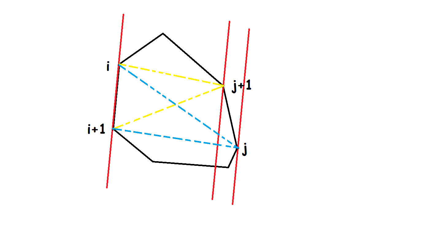 首先使用任何一种凸包算法求出给定所有点的凸包,有着最长距离的点对一定在凸包上。而由于凸包的形状,我们发现,逆时针地遍历凸包上的边,对于每条边都找到离这条边最远的点,那么这时随着边的转动,对应的最远点也在逆时针旋转,不会有反向的情况,这意味着我们可以在逆时针枚举凸包上的边时,记录并维护一个当前最远点,并不断计算、更新答案。