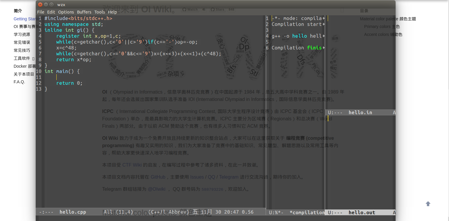 作为入门教程,这里仅介绍 Emacs 的基本功能,以及较方便地用 Emacs 编写、调试代码的方法。